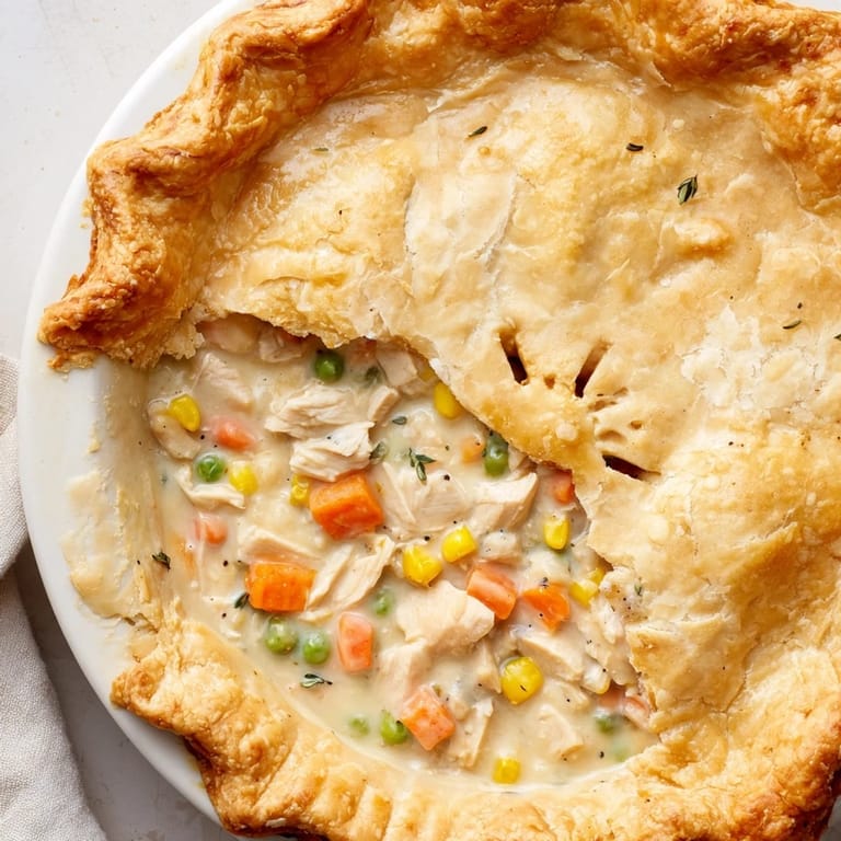 The beauty of pot pie is that it accepts changes gracefully—sometimes I swap turkey for chicken when I'm using up leftover Thanksgiving meat, and it's just as satisfying. A splash of white wine added when you're sautéing the vegetables adds a subtle sophistication that nobody can quite identify but everyone notices. If you're feeling ambitious, a double crust (on top and bottom) turns it into something more substantial and impressive looking.