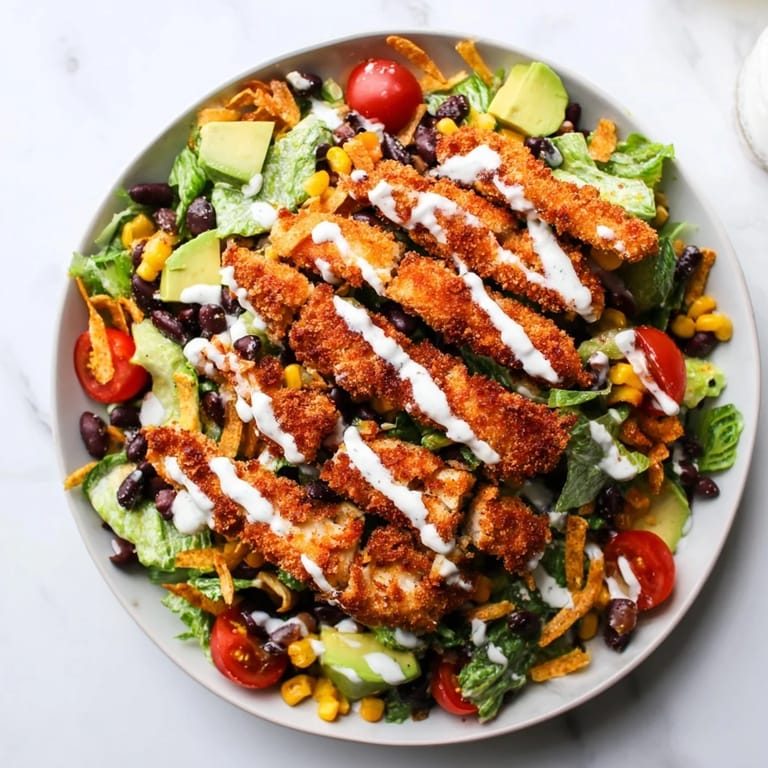 If you're meal prepping, store the chicken, salad components, and dressing in separate containers so nothing gets soggy. The chicken stays crisp for about two days in the fridge if you reheat it briefly in a hot skillet or toaster oven. The salad itself is best assembled fresh, but you can chop the veggies and prep the beans and corn a day ahead to save time. Just wait to slice the avocado and add the tortilla strips until you're ready to eat.