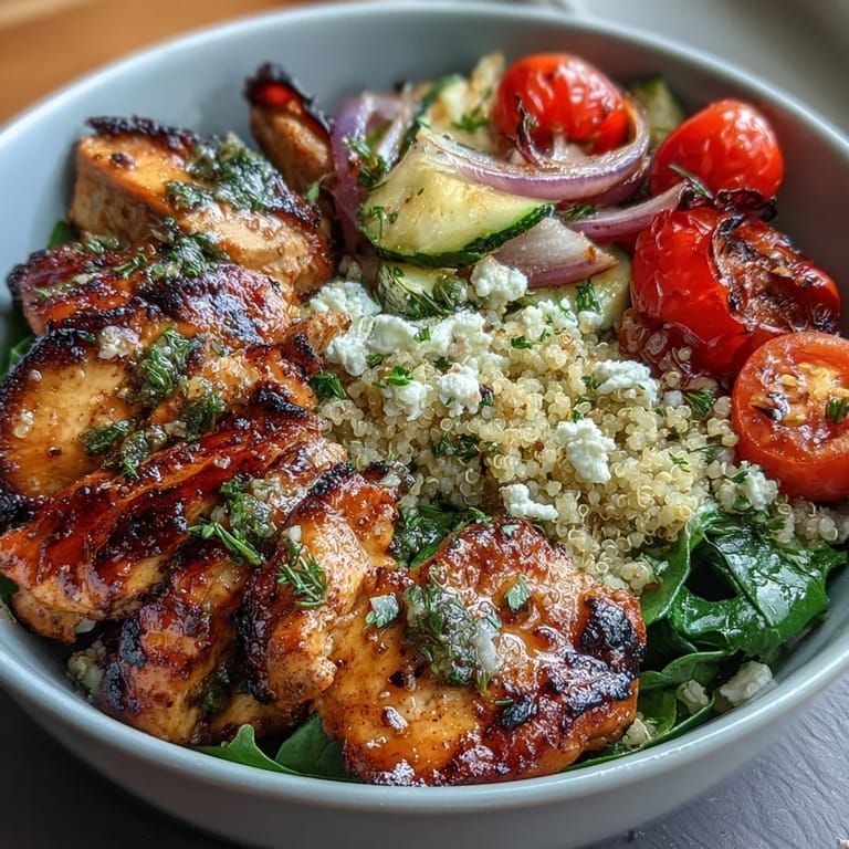 Save Discover the perfect harmony of bright, fresh flavors and wholesome ingredients with this Lemon Vinaigrette Grilled Chicken and Veggie Bowl. Juicy grilled chicken breast is kissed with a zesty lemon vinaigrette, paired with a colorful array of crisp vegetables and fluffy quinoa for a nutritious meal that satisfies both your taste buds and your health goals. Whether you're looking for a light lunch or a fulfilling dinner, this easy-to-make bowl is a crowd-pleaser packed with protein and vibrant textures.
