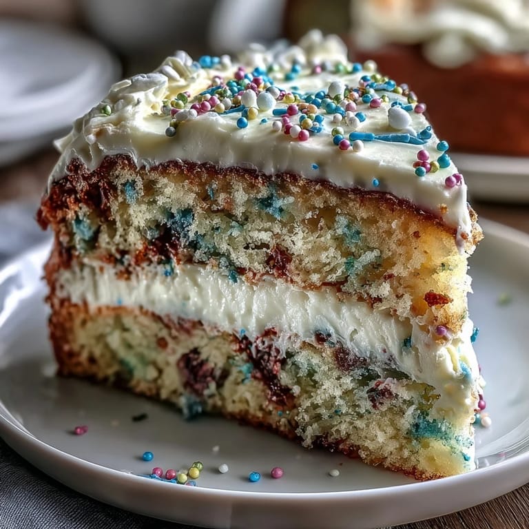 Save My neighbor knocked on the door last April with a box of pastel-colored sprinkles she'd found at an estate sale, asking if I had any ideas for them. I'd been craving something cheerful to mark the shift from winter, and those jimmies felt like permission to bake something unapologetically joyful. This cake emerged from that moment—a tender vanilla base studded with color, crowned with buttercream so soft and whimsical it almost seems a shame to cut into it.